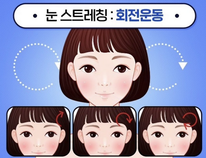 목이 뻐근할 때 목을 돌려주는 것처럼, 눈알을 상하좌우, 그리고 원을 그리며 굴려주면 근육의 긴장이 풀리면서 눈의 피로와 뻐근함이 즉시 해소됩니다.