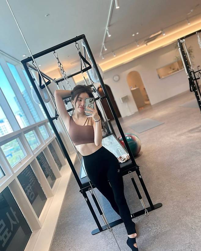 사진 속 설하윤은 필라테스 기구 앞에서 셀카를 찍고 있다. 짙은 브라운 톤의 슬리브리스 스포츠 브라와 하이웨이스트 블랙 레깅스를 매치해 몸매를 자연스럽게 강조했다. 상체는 콤팩트하게 잡아주고, 하체는 시크하게 정돈된 이 스타일링은 그녀의 슬림한 복부 라인과 탄탄한 다리선을 더욱 돋보이게 만든다. 발끝까지 완성도를 높이는 오픈토 요가 삭스 또한 기능성과 패션성을 동시에 갖췄다.