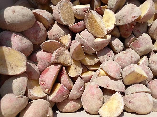 일반적인 방식은 먼저 씨눈을 보면서 감자를 3~4등분으로 자릅니다. 15도에서 20도 사이의 불 안 때는 방 같은 곳에서 1주일 정도 단면을 말리고 씨눈이 조금 나온 상태에서 심습니다. 최소 3일 전에는 잘라서 말리고 심어야 합니다.