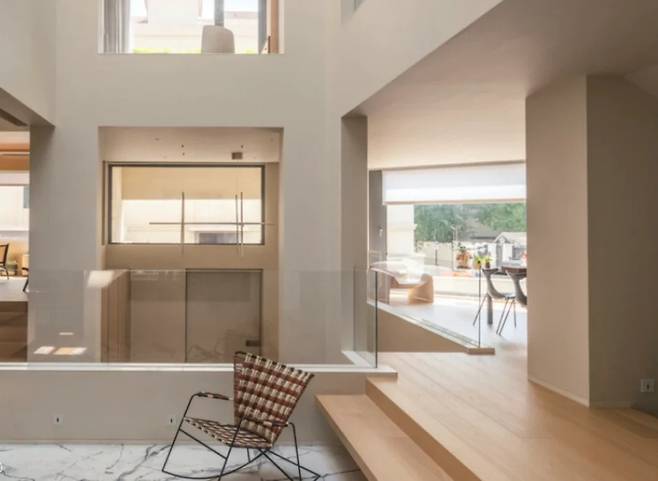 집 안의 여러 공용 공간은 층고에 따라 기능이 구분되는 독특한 구조를 보입니다. 현관, 다실, 거실, 다이닝룸, 서재 등의 공간은 시계 반대 방향으로 나선형으로 연결되어 있으며, 각 공간이 독립적이면서도 서로를 명확하게 볼 수 있는 3차원 공간 흐름을 형성합니다.