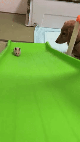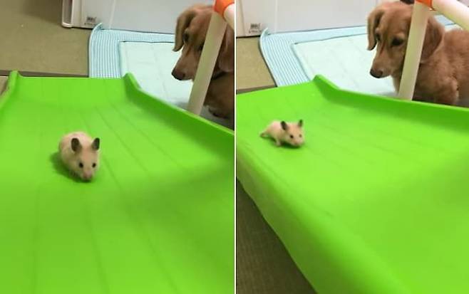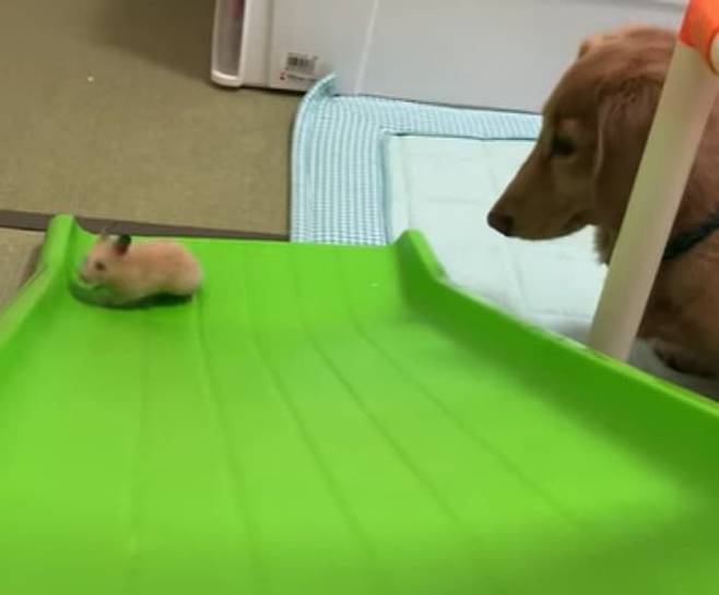 햄스터가 미끄럼틀 올라타기에 도전하는 동안 옆에서는 닥스훈트 강아지가 아련한 눈빛으로 햄스터의 도전을 가만히 지켜볼 뿐이었죠.