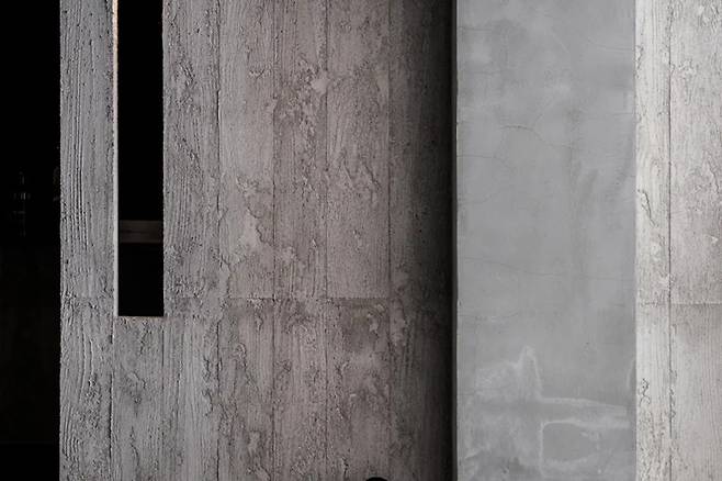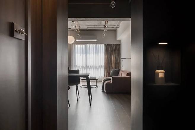 집의 시작은 현관에서부터 감정을 차분하게 가라앉힌다. 시멘트 질감의 차가운 바닥은 공간의 온도를 낮추고, 깊은 블랙 우드 패턴의 수납장이 그 분위기를 이어받는다.