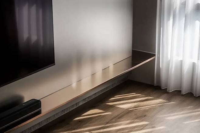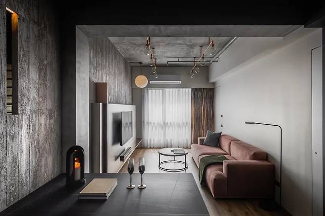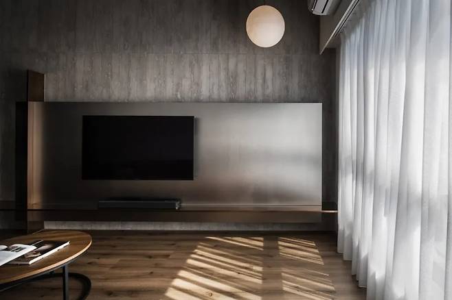 거칠지만 매력적인 시멘트 텍스처 벽이 거실의 주제를 주도한다. 하얀 광택 벽과의 뚜렷한 대비는 공간에 긴장감을 주고, 천장까지 매끄럽게 이어진 스틸 보드는 시선을 가로로 넓힌다. 그 안에 TV와 네트워크 장비가 감춰져 있어, 생활의 흔적을 은밀하게 숨기며 시각적 정리를 돕는다.