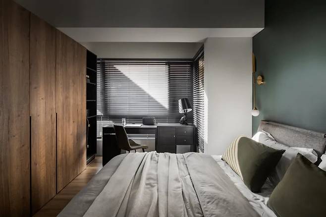 안방은 모노톤의 긴장을 풀어주는 모란디 그린 벽과 짙은 브라운 톤으로 구성된다. 텍스처는 약간 거칠지만 색상의 온화함이 마음을 안정시킨다.