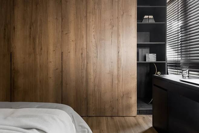 빛이 풍부하게 들어오는 세 면의 대형 창이 아늑함을 더하지만, 블라인드를 통해 시선을 조절하여 프라이버시를 완벽히 유지한다. 침실 한쪽에는 블랙 목재로 만든 서재 공간이 연결되어 있어 자연스럽게 흐르며 독립된 분위기를 형성한다.