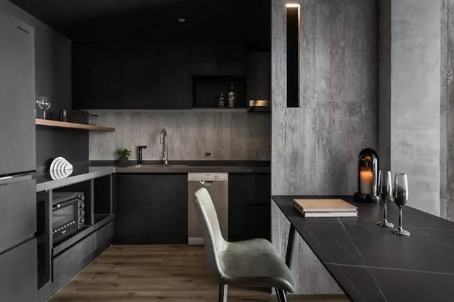 시멘트와 우드, 블랙 주방 가구의 강렬한 대비 속에, 개방형 목재 선반이 따뜻한 느낌을 더한다. 조리대와 식탁이 이어지는 선에는 시멘트 패턴 벽이 깊이를 더하고, 조명의 밝기와 어둠이 어우러져 오랜 시간 머물러도 지루하지 않은 공간을 만든다. 묵직한 재료와 질감이 식사의 깊이를 더해준다.