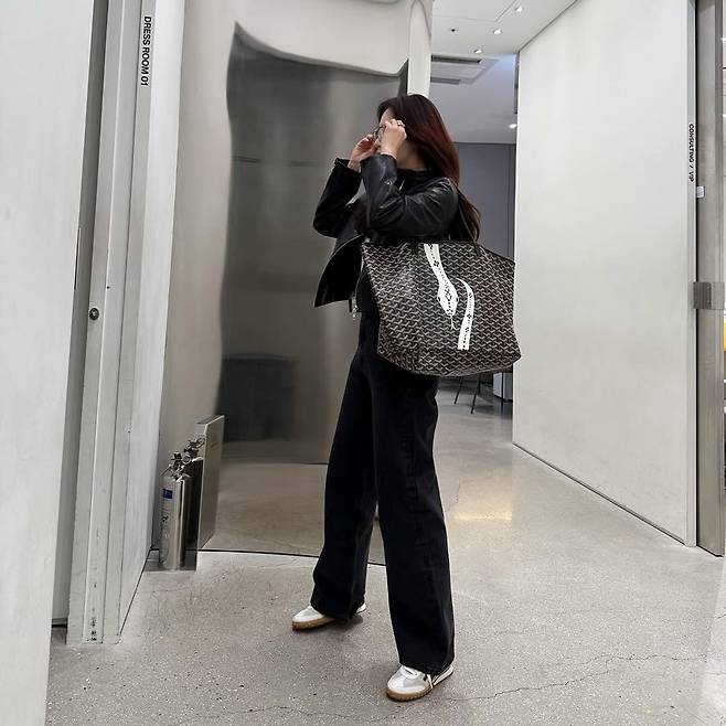 눈에 띄는 소품 활용도 인상적이다. 함은정은 모노그램 패턴이 돋보이는 빅 숄더백을 들어 스타일링에 포인트를 주었다. 전체적으로 무채색 톤으로 통일한 스타일 속에서도 백 하나로 세련된 변주를 주는 센스가 돋보인다. 손에 들고 있는 블랙 선글라스도 룩에 쿨한 무드를 더하는 디테일 포인트로 작용했다.