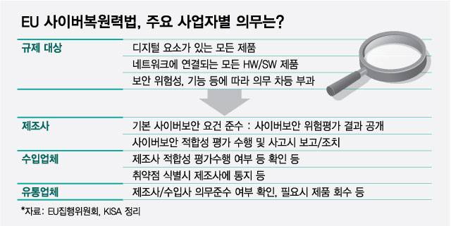 제조사는 사이버보안 관련 필수 요건을 준수하고 보안 적합성 평가를 수행하며 보안사고가 발생하면 즉각 신고하는 등 의무를 진다. '디지털 요소가 있는 제품'을 수입·유통하는 업체는 보안 적합성 평가를 수행했는지, 사이버보안 관련 규제를 준수하는 제품인지 여부를 확인한 후에만 EU에 해당 제품을 유통시킬 수 있다.