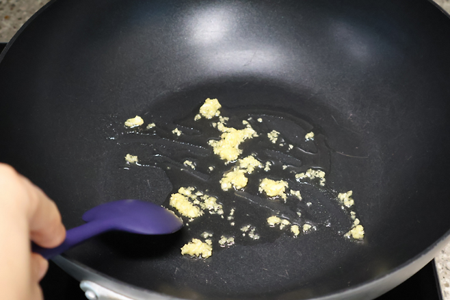 팬에 기름을 약간만 두르고 다진마을 1/2큰술 넣어 중불~약불 사이에서 볶아요. 오래 볶을 필요 없이 마늘이 자글자글 할 정도면 되는데 대략 15초? 20초 정도면 충분하답니다.