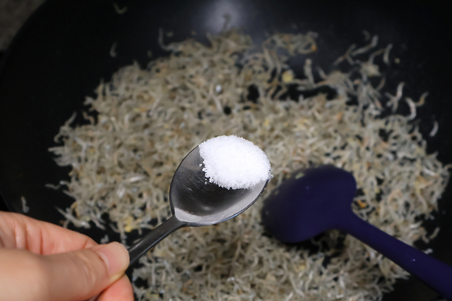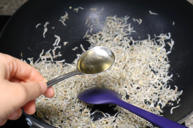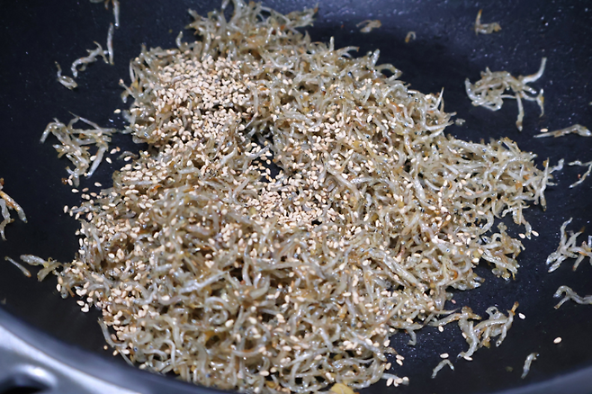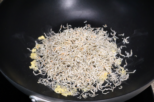 그럼 이제 멸치를 넣고 섞어요. 다진마늘과 멸치가 어우러지게 가볍게 볶아주고요.