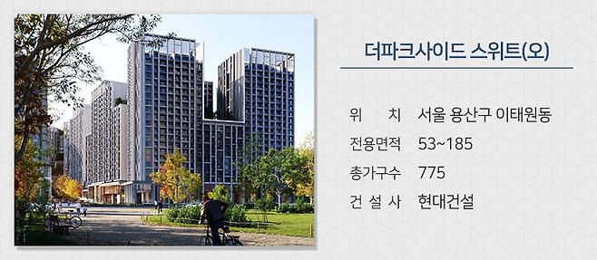 서울 용산구 옛 유엔사 부지에 들어서는 더파크사이드 서울의 오피스텔 상품인 '더파크사이드 스위트'가 분양합니다. 모든 세대에 프라이빗 전용 발코니가 적용되며 일부 타입에서는 용산 공원 조망도 가능합니다. 서울지하철 6호선 녹사평역, 이태원역을 이용할 수 있습니다. 내부 인테리어 및 마감재 등은 하이엔드 고급 브랜드로 꾸며지고 AI로봇 발레 주차 시스템도 적용됩니다.