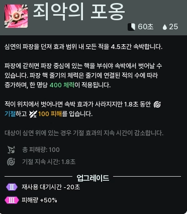 궁극기는 적의 이동기가 빠진 것을 확인하거나, 혹은 적의 도주 방향을 예상하여 미리 깔아두는 식으로 쓰면 됩니다. 발동 속도가 예상보다 훨씬 빠르기 때문에 아예 적 위치에 그냥 던져도 어지간하면 속박을 걸 수 있습니다.