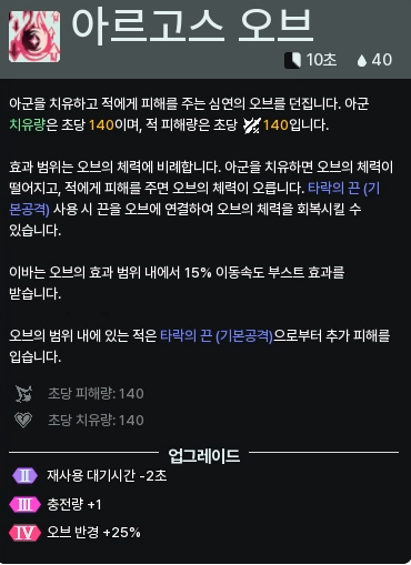 또한, 평타와 마찬가지로 오브의 영역에 닿은 적에게는 지속 피해를 입히고, 아군에게는 지속 치유 효과를 줍니다. 차이점이라면 평타는 1인 대상이라면 오브는 범위 내의 모두에게 효과를 미치기 때문에 광역 딜과 광역 힐을 동시에 수행할 수 있습니다.