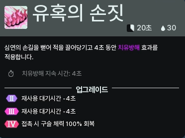 Q 스킬 유혹의 손짓은 발동이 느려서 적을 끌고 오는 형태로는 사용하기가 어렵고, 적의 근딜이나 습격이 있을 시 이바의 발 아래에 깔아서 다시 멀리 밀치는 생존기의 용도로 활용하는 것을 추천합니다. 그랩류로 활용하기에는 쿨도 너무 길고 변수가 많은 스킬입니다,