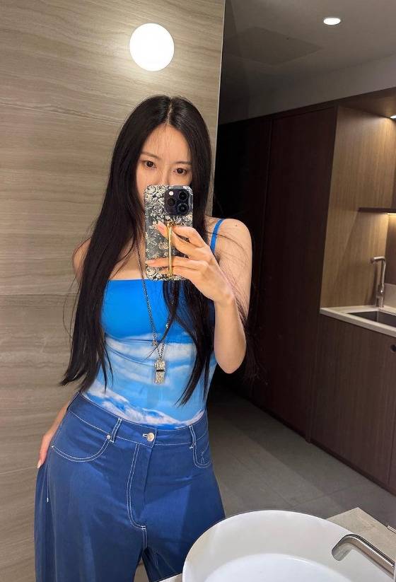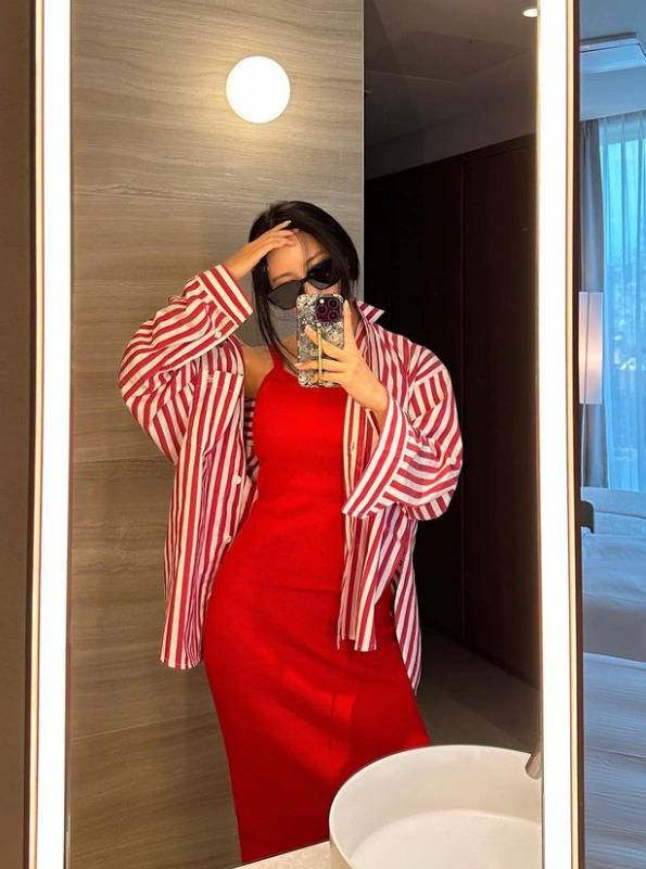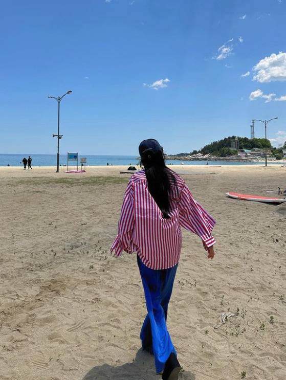 효민은 바캉스중 블루,레드 계열등 원색 의상으로 스타일리쉬한 느낌의 패션을 선보였습니다.