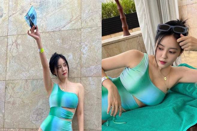 효민이 그라데이션 수영복을 바캉스룩으로 선보였습니다.