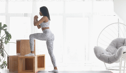스텝박스나 단단한 오를 수 있는 도구 앞에 섭니다. 손은 가슴 앞에서 모은 채 왼발을 먼저 도구 위에 올립니다. 이어 오른발도 올려 양발이 도구 위에 올라가도록 합니다. 오른발부터 바닥으로 내려오며 원위치로 돌아옵니다.