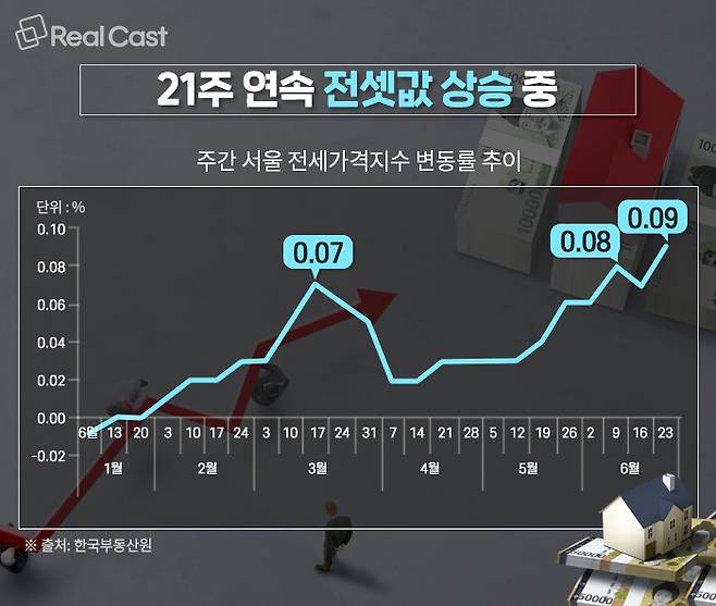 한국부동산원에 따르면 6월 4주(23일) 서울 전셋값 변동률은 0.09%로 올해 들어서 가장 높은 상승률을 기록했습니다.
