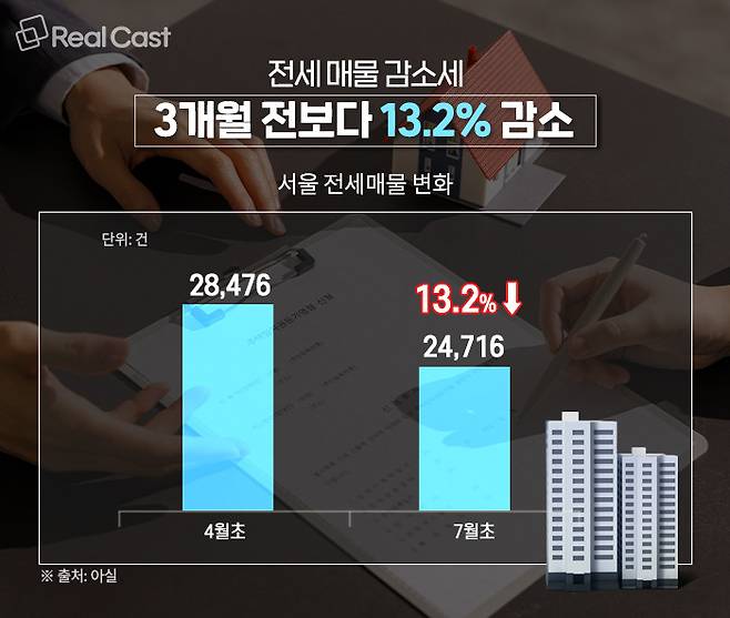 최근 전세 매물도 줄어들고 있는 모습입니다. 아실에 따르면 7월 첫 주 기준, 서울 전세매물은 2만 4,716건으로 2분기의 시작인 4월초(2만 8,476건) 대비 13.2%가 감소했습니다.