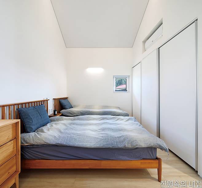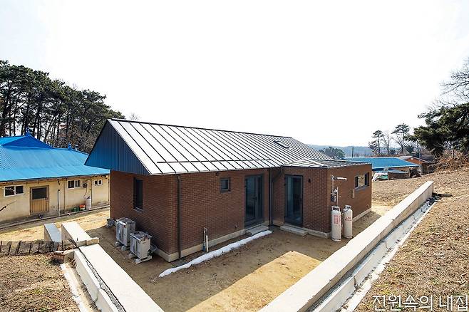 새집은 건축주 부부와 부모님 세대의 적절한 거리감과 남향 채광을 위해 도로와 평행하게 앉혀졌다. 최소의 땅에 ‘ㄱ’자의 집을 얹고, 농 부처럼 소박하지만 단단하게 집을 구성했다. 깔끔함을 더해줄 콘크리트 기단과 땅의 색을 닮은 벽돌 벽 위에 단정한 금속 지붕을 얹었다. 현관으로 들어서면 긴 복도가 거실부터 안방까지 막힘없이 이어진다. 좁은 듯 긴 복도를 지나 거실로 들어서면 지붕선까지 열린 천장으로 확 넓어지며 주방이 나타난다. 복도와의 대비 덕분에 거실과 식당, 주방으로 이어지는 공간은 더욱 극적인 개방감이 느껴지게 된다. 여기에 안방과 거실 사이에 자리한 ‘집 속의 집’을 떠올리게 하는 작은 방은 바깥에서처럼 정직함 속 작은 웃음을 짓게 한다. 천천히 삶의 기반을 옮겨오며 적응하고 있다는 건축주는 아직 심을 것도 가꿀 것도 많다며 마당을 가리킨다. 맨흙이 드러나 보이는 마당을 잔디와 꽃, 나무로 채워 집을 완성할 그의 계획에서 농부의 마음이 엿보이는 듯했다.
