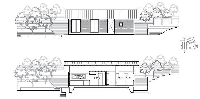 ‘농가’는 많은 것을 내어준다. 너른 땅은 키워낼 작물에 양보하고, 경사진 땅 한편에 자연과 벗하며 겸손하게 자리한다. ‘농가’는 분주하다. 마당도 마냥 놀리지 않는다. 창고가 놓이고, 평상이 깔려 작업 공간으로 쓰이고, 그래도 남는 땅은 또 텃밭이 된다. 농 부들은 그렇게 바지런히 살아낸다. 건축주의 부모님도 이 땅의 농부로서 평생 집을 지켜왔다.