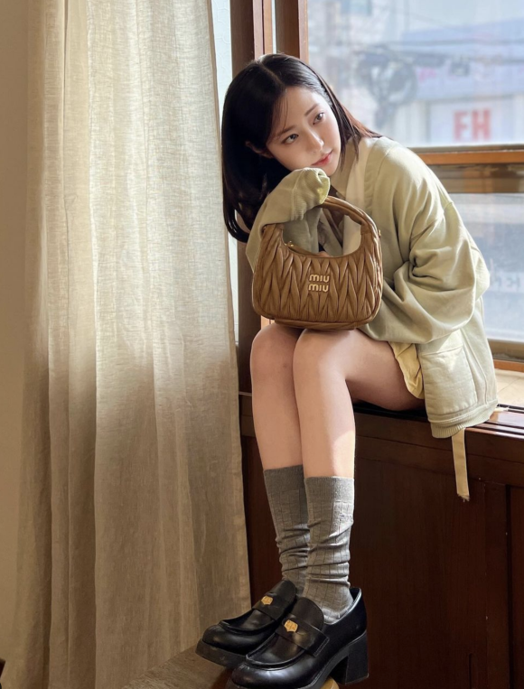 신슬기가 착용한 제품은 ‘미우미우 완더 마테라쎄 나파 가죽 호보백’으로, 브랜드 특유의 정교한 가죽 공예가 돋보이는 제품이다.