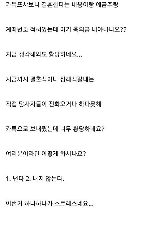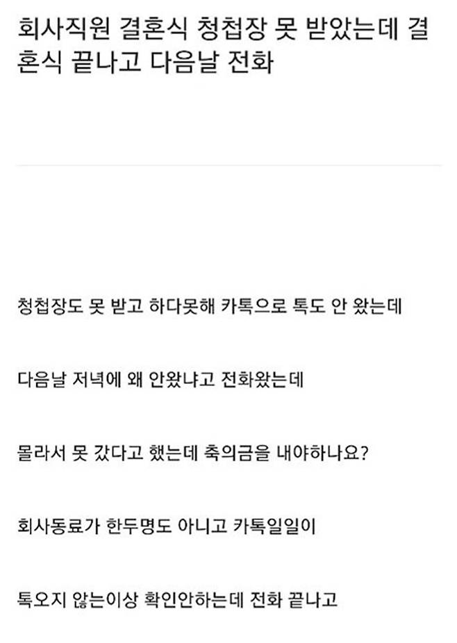 결혼식을 준비하다 보면 아무래도 바쁘다 보니 연락에 소홀해지는 경우가 종종 있다고 들었다. 그래서 모바일로 청첩장을 주면서 양해를 구해서 결혼식이 끝나고 만나기도 한다. 바쁜 경우에는 서로 배려하려는 편인데, 그렇지 않은 경우가 문제가 된다. 바쁘지도 않았고 청첩장을 주지도 않아서 당연히 안 갔는데, 오히려 왜 안 왔냐고 화내는 사람들. 실제로 이런 일을 겪었다는 사람의 후기가 올라와 화제가 되고 있다.