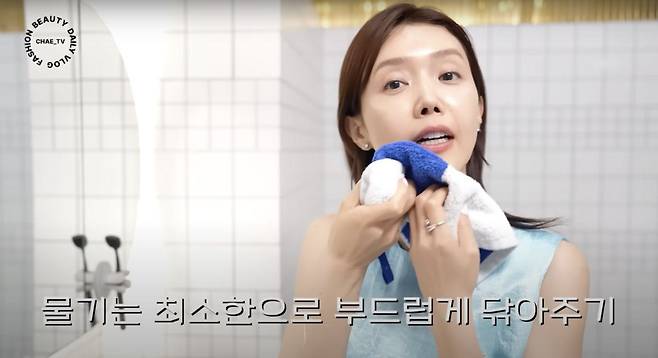 채정안은 세안 후 수건 관리에 특히 신경 쓴다. 수건은 주기적으로 교체하고, 세탁 시 섬유유연제를 사용하지 않으며, 단독 세탁을 원칙으로 한다. 세안 후에는 수건으로 얼굴을 문지르지 않고, 가볍게 눌러 물기를 제거해 피부에 자극을 최소화한다. 이는 미세한 상처나 자극을 줄여 피부 장벽을 보호하는 효과가 있다.