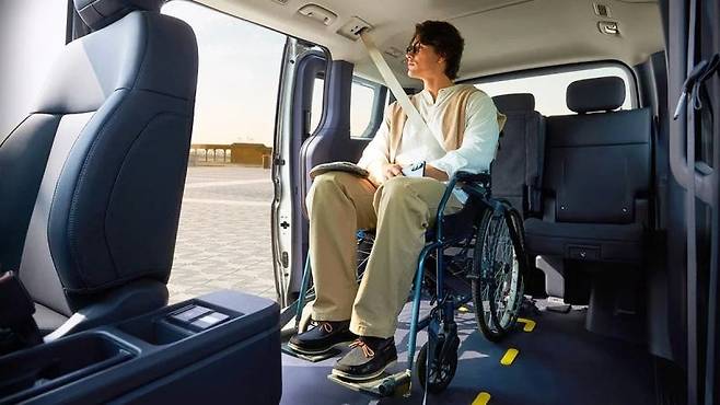 PV5 WAV의 핵심은 775mm의 넓은 개구폭을 확보한 측면 슬라이딩 도어에 있습니다. 수동식 인플로어 2단 슬로프는 보도블록의 높이나 경사도에 따라 길이를 조절할 수 있어 다양한 환경에서의 제약을 최소화했습니다. 슬로프는 최대 300kg의 하중을 견딜 수 있어 전동 휠체어도 무리 없이 이용 가능하며, 사용하지 않을 때는 바닥에 수납되어 적재 공간을 차지하지 않습니다. 또한, 6대4 쿠션 팁업 시트와 3점식 안전벨트를 적용해 동승자의 편의와 안전까지 꼼꼼하게 챙겼습니다.