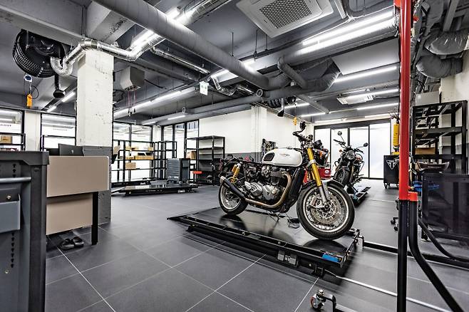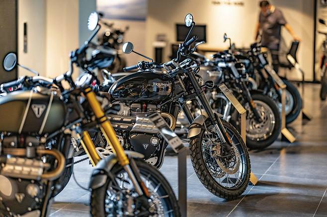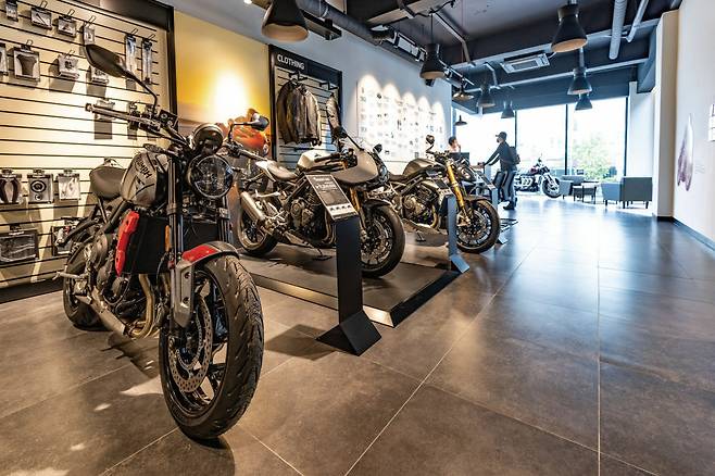 전시장을 포함한 건물 정면이 통유리로 이루어져 따뜻한 분위기가 연출되어 고객들은 편안한 분위기 속에서 다양한 트라이엄프 모델에 앉아보고 살펴보는 모습이었다. 또한, 가족 단위로 방문한 고객을 위해 캐리커처 이벤트와 색칠놀이 세트를 구비하는 센스도 돋보였다. 이미 전시되고 있는 모델을 포함하여 순차적으로 전시 모델을 늘려나가 약 22대까지 확대할 예정이며 현재 시승 차량은 타이거 스포츠, 스피드 트윈, 트라이던트, T100, 스크램블러 1200까지 총 5대라고 전했다. 또한, 추후에는 신형 타이거 1200 랠리 익스플로러도 추가하여 고객들이 더 쉽게 시승하고 느껴볼 수 있도록 마련할 예정이다.