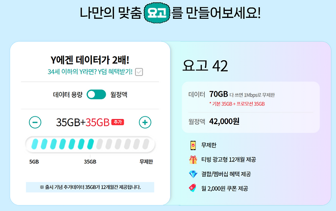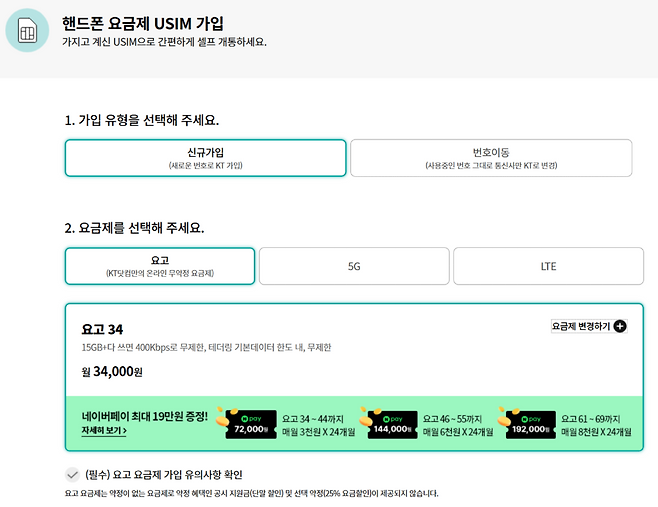 살펴보니 이렇게 구매한 유심은 KT요고요금제로 가입을 할 수 있도록 되어 있었습니다. 평소 쓰던 요금제는 보통 5G를 기준으로 비싼 것이 많았는데 생각보다 싼 것도 많아 경제적이었고, 데이터도 덤으로 좀 더 줘서 경제적이라고 생각했습니다.