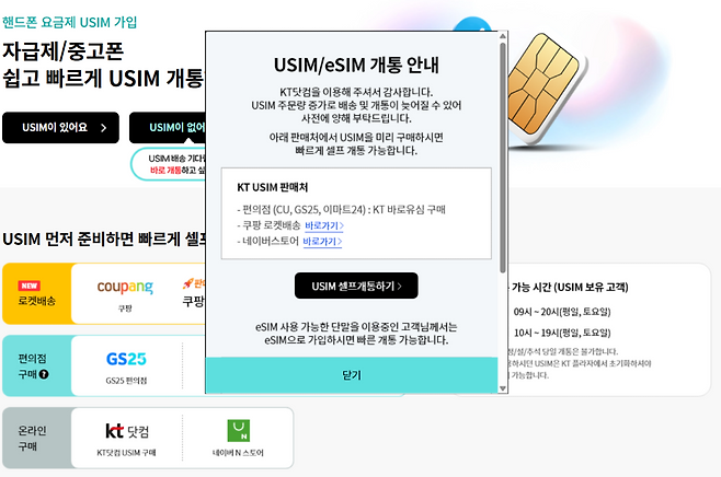 KT홈페이지를 방문해보니 몇 군데 유심을 구매후 바로 장착할 수 있는 서비스가 있었습니다.