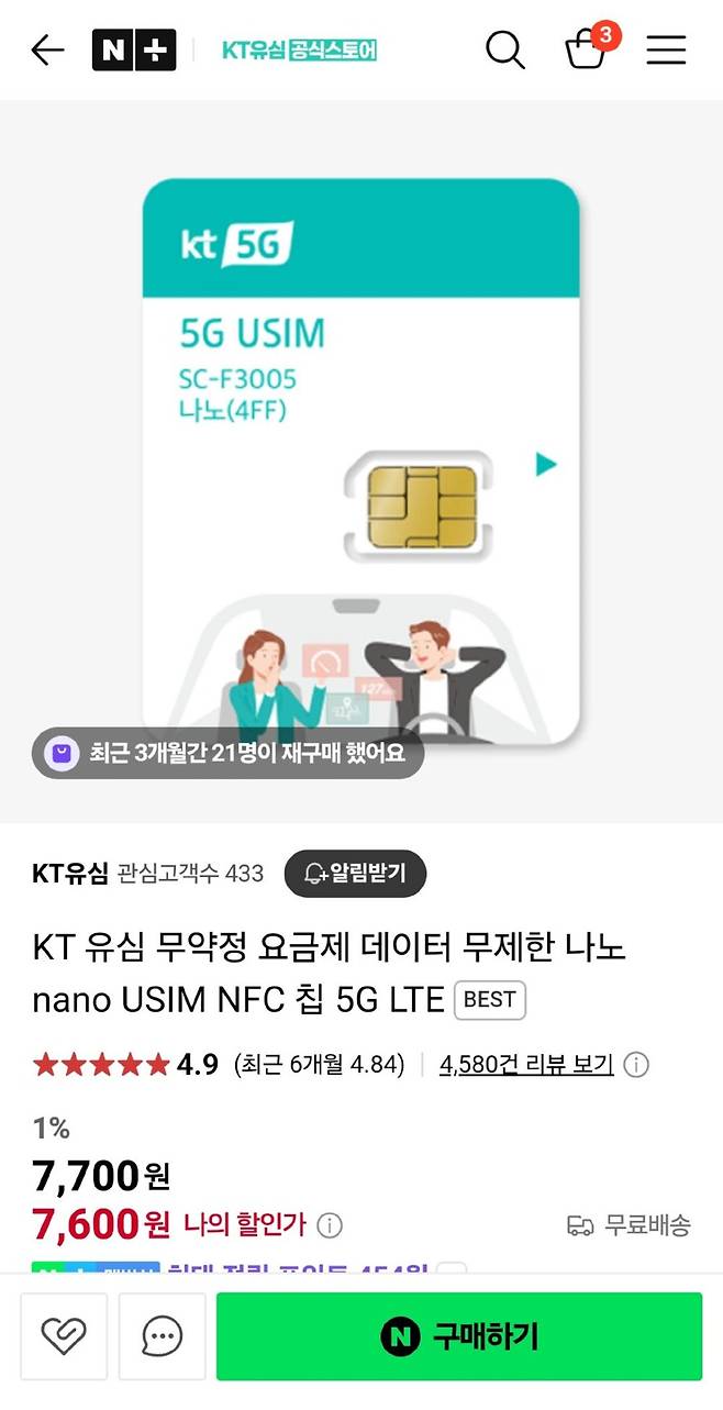저는 이 가운데 네이버 스마트스토어를 통해 구매했고 다음날 제품을 받았습니다. 가격은 7,700원에 배송료 포함이었습니다. SKT도 이렇게 유심을 보내주었으면 정말 좋았을텐데 말입니다.