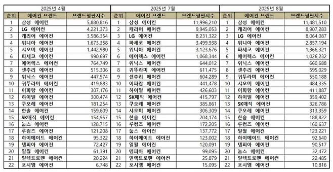 이번 8월 조사 결과는 여름 막바지의 소비 흐름을 그대로 담았다. 삼성은 점수가 줄었음에도 여전히 강력한 브랜드 파워를 보여주며 1위를 지켰다. 캐리어와 LG도 각각의 장점을 내세우며 추격을 이어가고 있어, 향후 경쟁 구도에 관심이 모이고 있다.