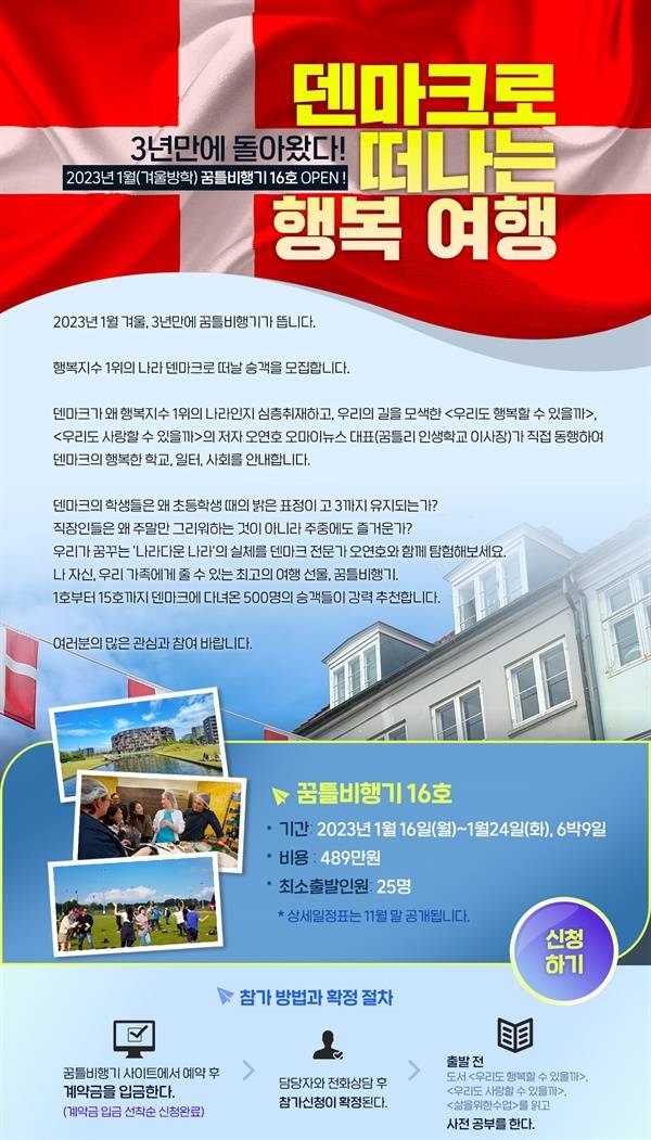 | ▲ 꿈틀비행기16호 홍보물 2023년 1월 16일~24일, 6박9일의 덴마크로 떠나는 행복여행. |
