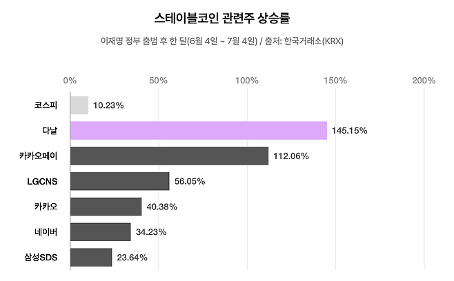 스테이블코인 관련 기업 주가가 크게 올랐어요. 제도화를 공약한 이재명 대통령이 임기를 시작하면서 들썩이기 시작했는데요. 이 대통령 취임 한 달 사이 카카오페이 주가가 112% 이상 오르는 등 스테이블 코인 관련주 상승률이 코스피 상승률을 크게 웃돌고 있어요.