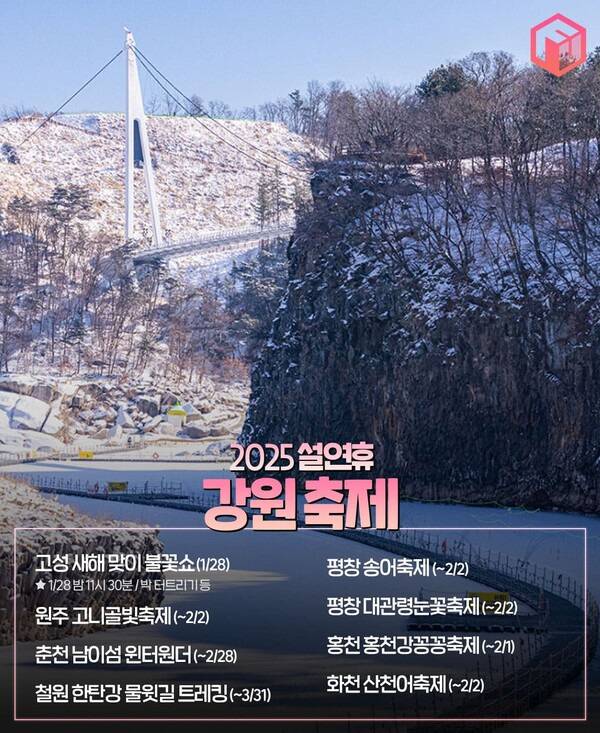강원도에서 설 연휴 가볼만한 곳은 평창과 철원, 화천 등이 있는데요. 고성에서는 1월 28일 밤 11시 30분, 화려한 불꽃쇼가 해변 앞에서 펼쳐질 예정입니다. 철원 한탄강 일원에서는 주암절리길 사이, 물 위의 부교를 거니는 특별한 경험을 할 수 있죠.