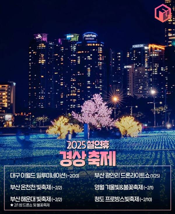 대구 이월드, 부산 온천천, 해운대 및 광안리는 겨울밤 화려하고 낭만적인 불빛축제가 이어지죠. 영월과 청도에서도 불빛축제가 이어지니 설 연휴에 가까운 곳을 방문해 밤 산책을 만끽해보세요!