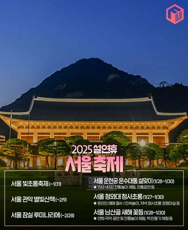 설 축제로는 운현궁의 운수대통 설맞이 축제가 1월 28일부터 30일간 개최됩니다. 오전 11시부터 오후 4시까지이며 전통놀이체험, 전통 공연 등이 펼쳐집니다. 서울 청와대에서는 청사초롱 설맞이 행사가 진행되는데요. 온라인 예매자에 한해 입장이 가능하며 저녁이 되면 청사초롱을 들고 정원마실 프로그램을 즐길 수도 있습니다.