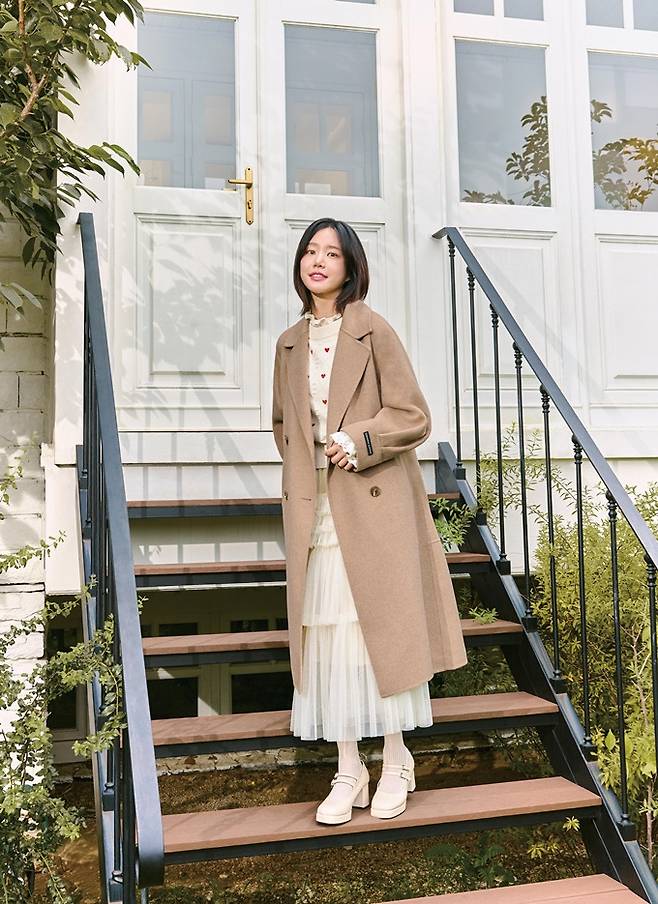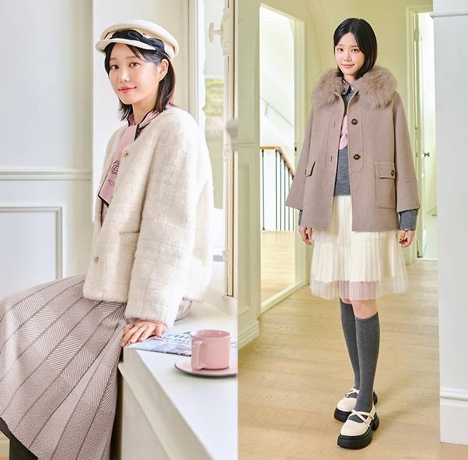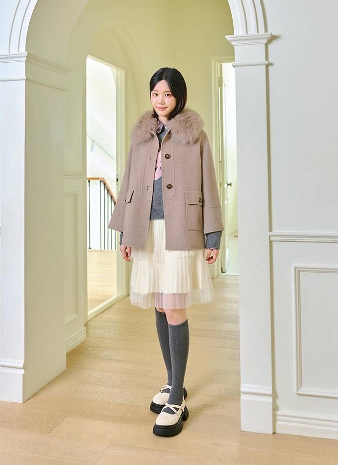 또 다른 화보에서는 탈부착 가능한 폭스 퍼 장식과 캐시미어 소재로 보온성을 높인 핸드메이드 코트와 핑크 패턴 디자인의 그레이색 니트, 티어드 스타일 니트 스커트를 매치해 따뜻하면서 러블리한 착장을 선보였다.