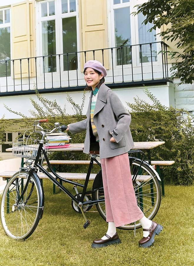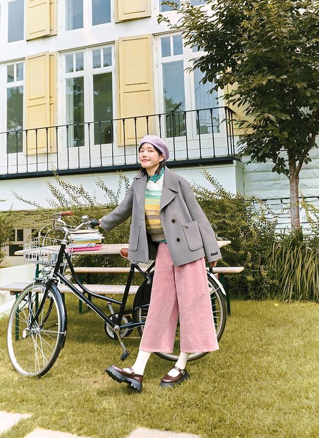 또 울과 캐시미어 혼방 소재를 사용하여 고급스러운 아웃핏과 터치감이 부드러운 숏자켓을 다채로운 컬러 배색 니트와 레트로 스타일의 그린 셔츠를 레이어드 하고, 여유로운 핏의 핑크 코듀로이 팬츠를 매치해 발랄한 캐주얼 룩을 완성했다.