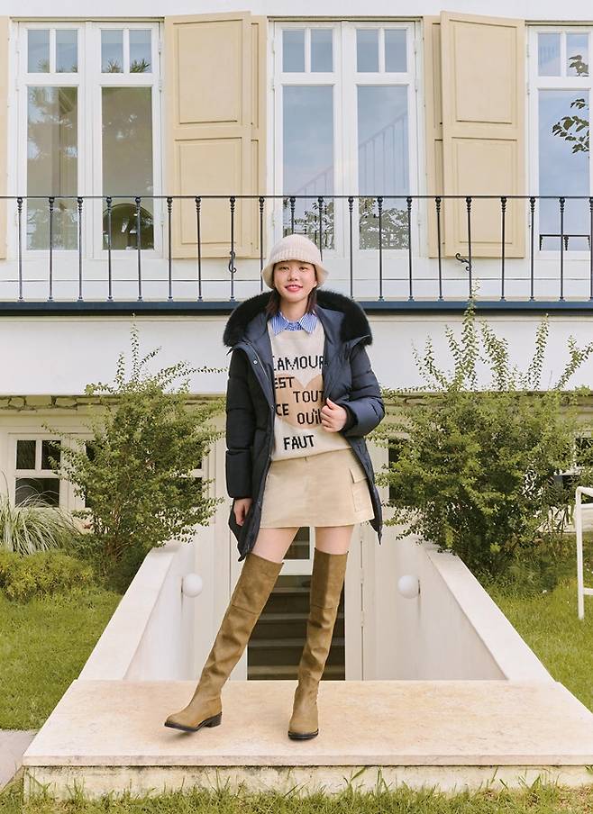 마지막으로는 다가올 한파 대비를 위한 구스 다운 에센셜 패딩으로 자연스러운 광택감과 슬림한 허리선 라인을 강조했으며, 이너로는 레터링 니트와 미니 스커트 매치로 다소 무거워 보일 수 있는 다운 패딩 스타일링을 산뜻하게 보완하며 스타일리시한 룩을 완성했다.