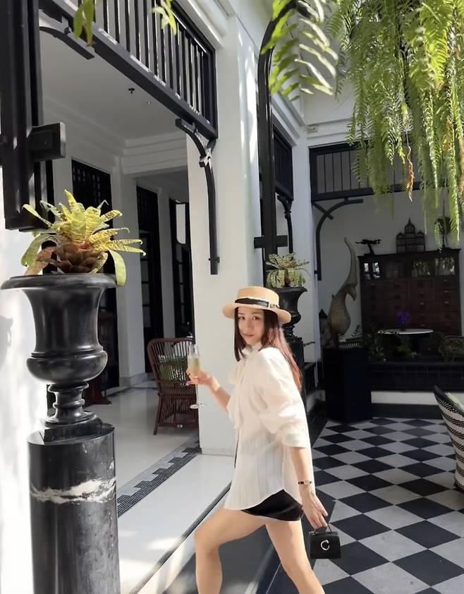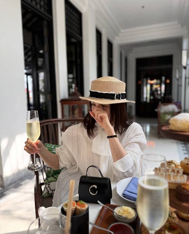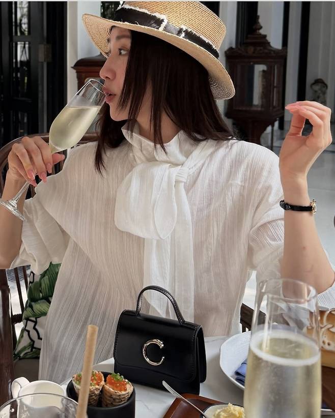 여기에 자연스럽게 흐르는 실키한 머릿결과 맨살에 닿는 햇살이 어우러져 리조트 무드를 극대화했으며, 손에는 샴페인 잔을 들고, 다른 한 손에는 블랙 미니 토트백을 쥔 채 여유로운 포즈를 취해 여신 비주얼을 과시했습니다.