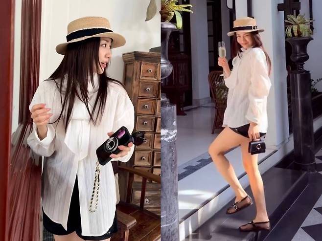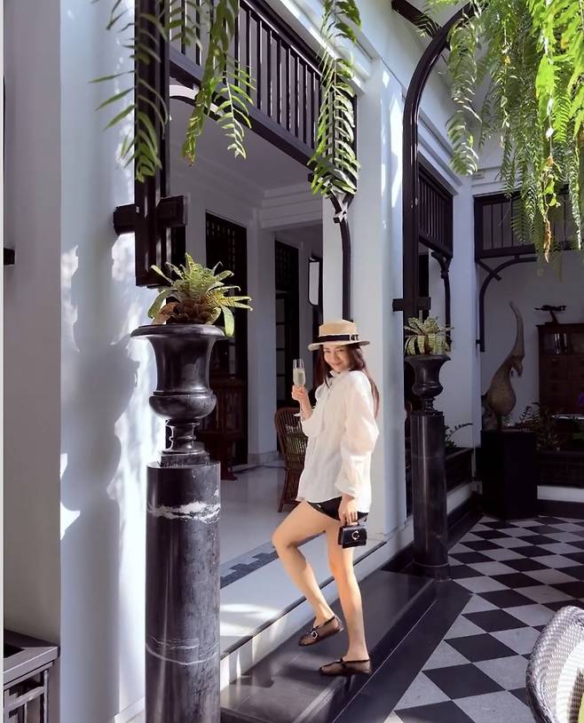 특히 볼륨감 있는 리본 디테일이 돋보이는 화이트 셔츠는 박하선 특유의 청순하고 우아한 이미지를 한층 살렸고, 블랙 스트랩 플랫슈즈로 발끝까지 스타일을 완성하며 클래식하고 세련된 리조트 룩을 완벽하게 소화했습니다.