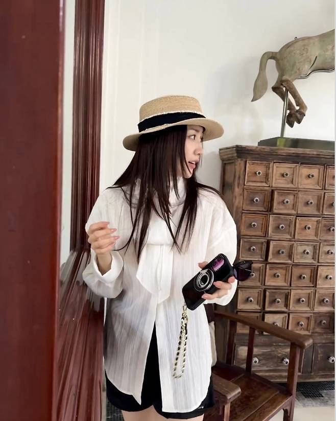 박하선은 화이트 셔츠에 블랙 숏팬츠를 매치하고, 스트로 햇(밀짚모자)으로 청량한 분위기를 완성했습니다.
