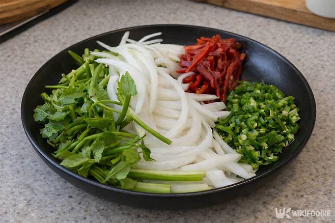 양파는 얇게 채 썰고 미나리는 손가락 두 마디 정도 길이로 자른다. 홍고추와 청양고추는 씨를 털어낸 뒤 잘게 다지거나 얇게 썰어 준비한다.