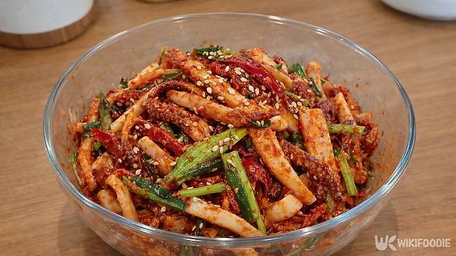 수분을 짠 무와 오이에 고춧가루 1큰술을 먼저 넣고 버무려 붉은색을 입힌다. 그다음 오징어와 양념장 절반을 넣어 먼저 무친 뒤, 나머지 채소와 남은 양념을 넣고 가볍게 버무리며 마무리한다. 채소를 나중에 넣어야 아삭함이 유지된다.