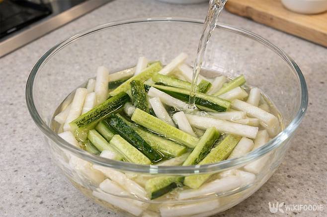 무는 나박하게 썰고 오이는 길게 반으로 갈라 무와 비슷한 크기로 편 썬다.