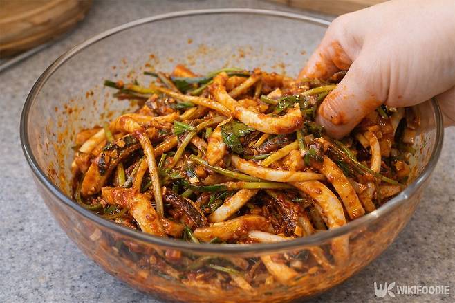 수분을 짠 무와 오이에 고춧가루 1큰술을 먼저 넣고 버무려 붉은색을 입힌다. 그다음 오징어와 양념장 절반을 넣어 먼저 무친 뒤, 나머지 채소와 남은 양념을 넣고 가볍게 버무리며 마무리한다. 채소를 나중에 넣어야 아삭함이 유지된다.