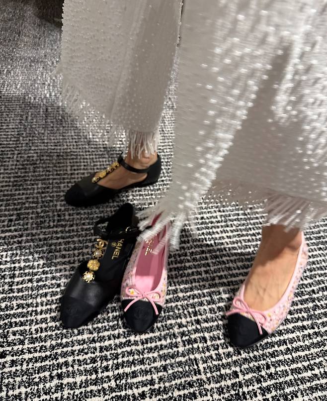 트위드 셋업을 입은 모델의 초상 앞에서 블랙 트위드를 입은 박하선이 앉아 있는 구도